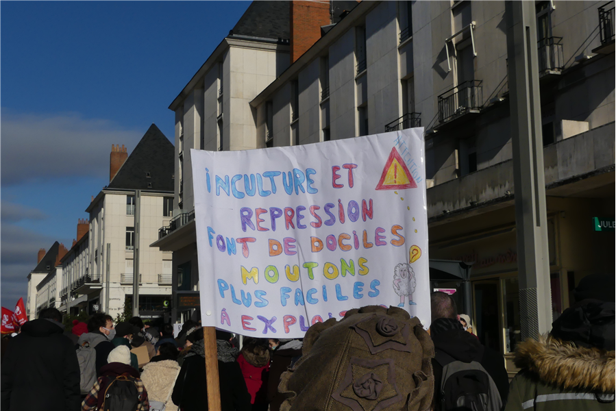 « Nous sommes plusieurs à avoir pris des antidépresseurs » explique une manifestante pour que l’on se rende compte de l’état psychologique dans lequel se trouvent plusieurs personnes présentes. Le cortège s’est rassemblé vers midi au pied du théâtre Olympia où s’est tenue une assemblée générale du collectif CIP37, réunissant artistes, techniciens et autres professionnels du monde de la culture. La réunion a semble-t-il été forte en émotions, avec des témoignages de situations complexes comme celle des élèves du Conservatoire de Tours.