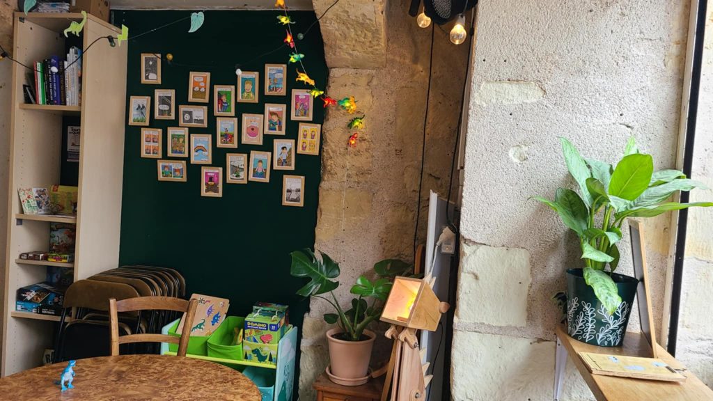 Au final, ça fait une équipe de 30 ans de moyenne d’âge avec un esprit enfantin bien conservé (il y a d’ailleurs un espace de jeux pour les plus petits près de l’entrée). “Dans notre réseau il y a aussi des musiciens, des peintres, des dessinateurs… On a rapidement eu des sollicitations” raconte Merlin Marseault qui montre le présentoir à cartes de visite du comptoir, recensant tous les amis du P’tit Rex (restaurateurs, artistes, artisans…).