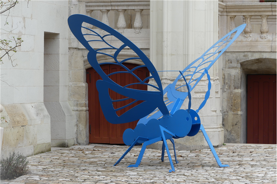 Il flotte comme un air de printemps à Tours… Les arbres se couvrent de fleurs, au jardin c’est l’heure des premières plantations. On ne va pas tarder à voir pulluler les insectes. A moins qu’ils ne soient déjà là ? Et en grand format, en plus ! Papillon, criquet, mante religieuse… Toute une ménagerie gentiment posée sur les pavés de la cour de l’Hôtel Gouïn.