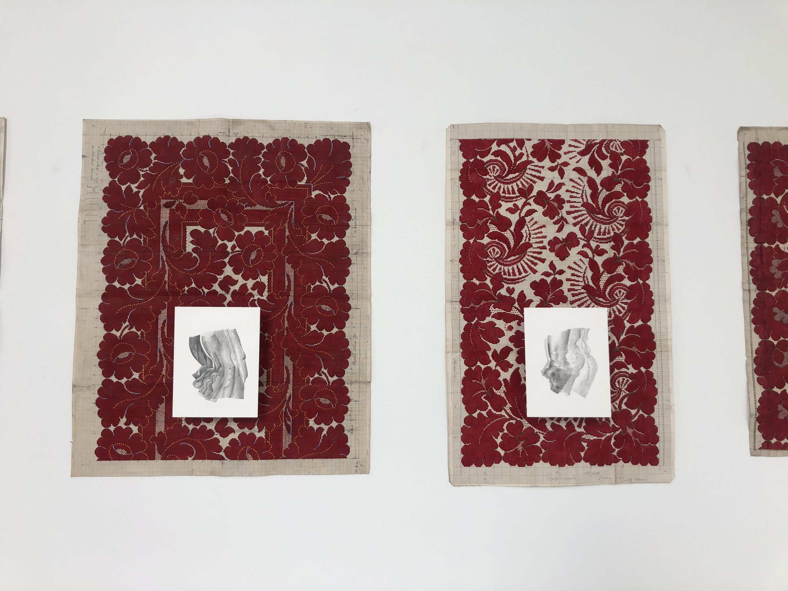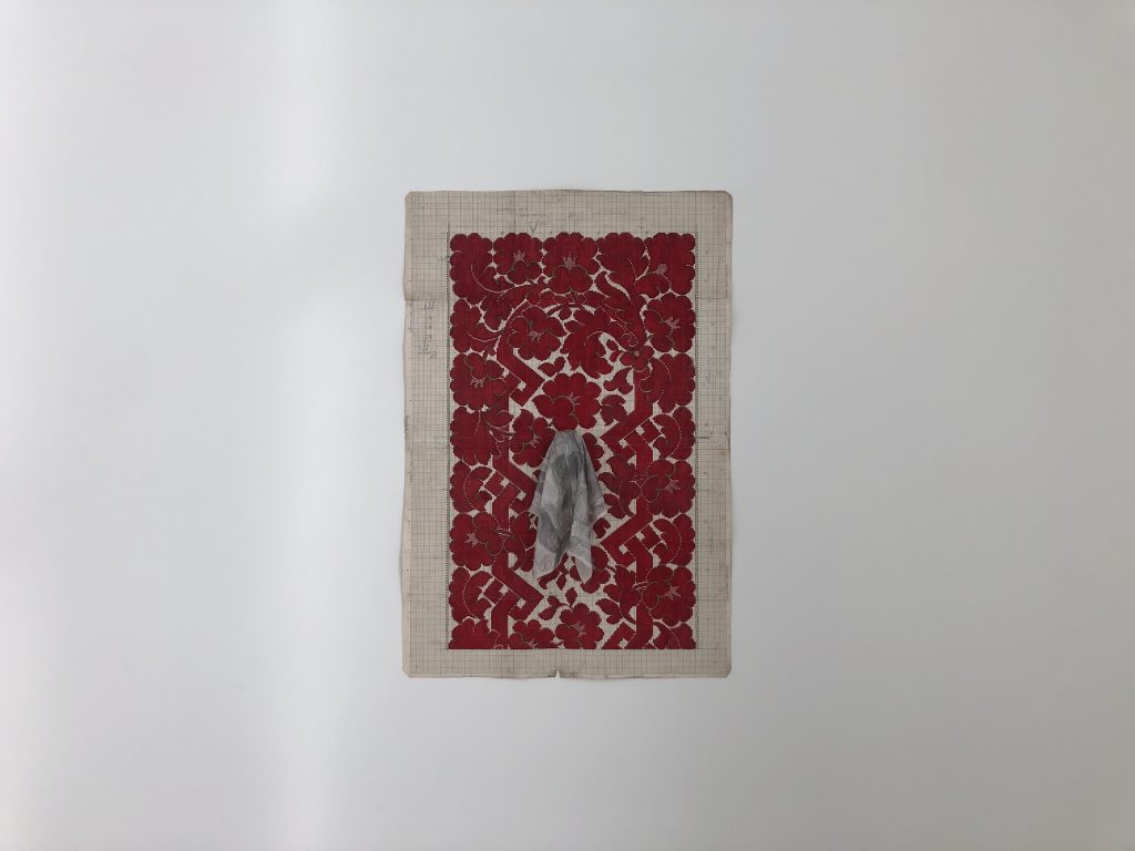 Dans cette optique, l’artiste a ajouté à son exposition une série de dessins (par technique de frottage) accompagnés de soie de Tours. Une pièce de cette série, isolée des autres et agrémentée d’un foulard, est d’ailleurs un hommage direct à sa grand-mère.