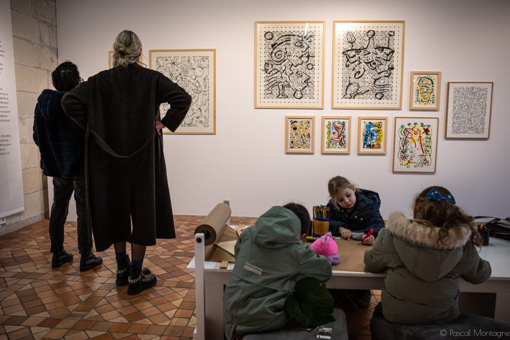 Sophie et ses enfants, en promenade, apprécient tous les dessins enlevés, colorés. Celle qui vivait non loin de l’atelier de l’artiste apprécie ces dessins qui ont fait partie de son enfance. “Ces accumulations de petits noirs et blancs, ça ouvre mon imaginaire” confie-t-elle, tandis ses trois filles s’essaient au dessin “Spiessertien” grâce à une longue feuille de papier kraft et des patrons en bois des formes fréquentes de l’artiste.