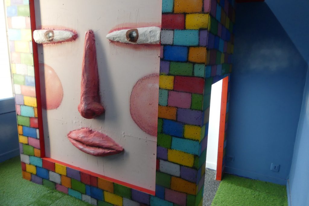 L’Hôtel Laloux se veut une distraction familiale avec plusieurs pièces interactives. Si l’esprit général est inspiré du street art (graff, détournement de panneaux de signalisation), on y trouve aussi beaucoup d’art contemporain ludique. Par exemple cette pièce avec jeu d’adresse ou une ancienne chambre affublée d’une petite maison pour les enfants. Ou encore une fresque dont on peut transformer la physionomie en faisant bouger des carreaux. On trouve par ailleurs des références au cinéma, à la pop culture, l’environnement… ou l’hôtellerie.