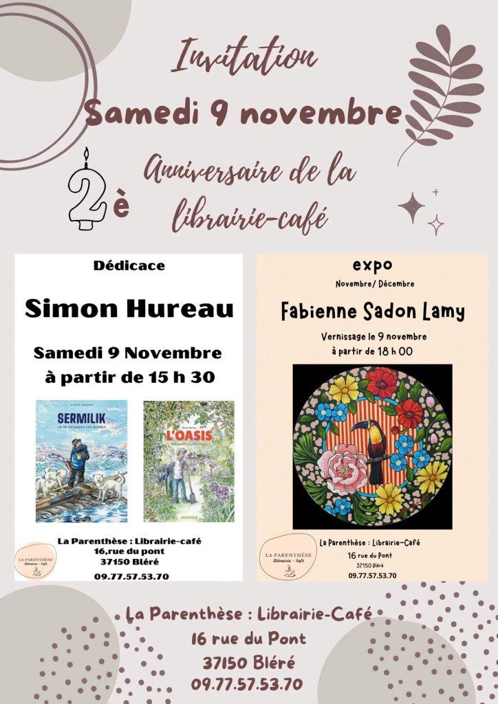 A l’occasion de l’anniversaire de la librairie-café, nous aurons la chance d’accueillir Simon Hureau pour une séance de dédicaces à partir de 15 h 30 et Fabienne Sadon Lamy à partir de 18 h, pour le vernissage de la nouvelle exposition.