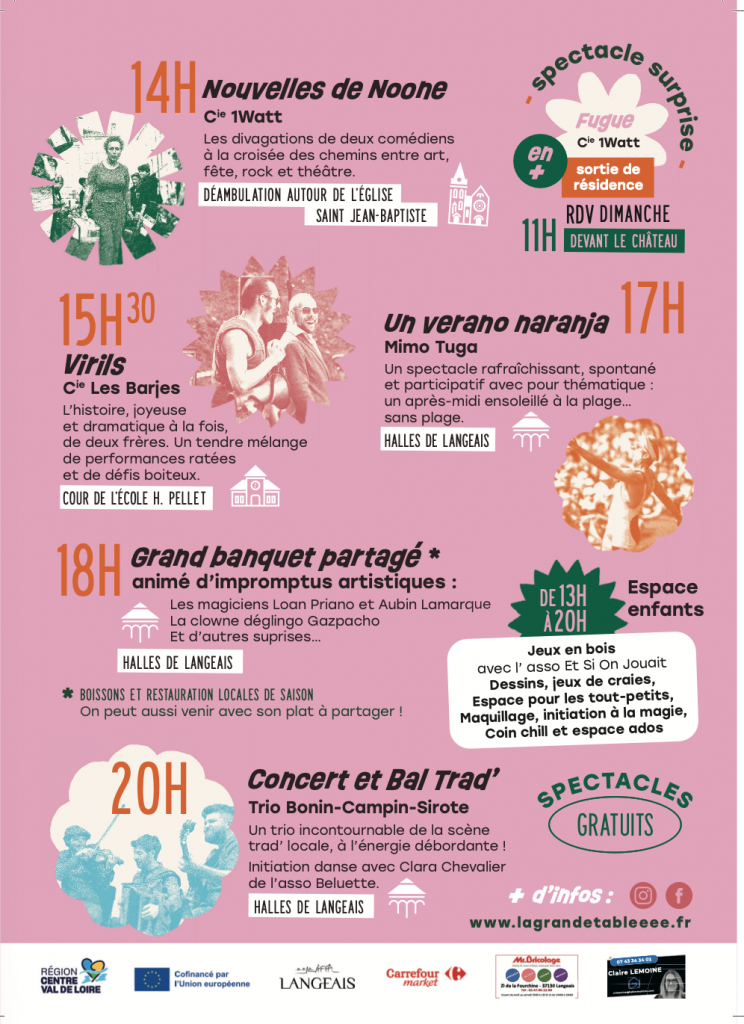 Au programme: 3 spectacles de rue à découvrir sur l’après-midi, des espaces animés pour petits et grands, un grand banquet populaire partagé avec des impromptus artistiques et une soirée bal trad’, concert et danses pour clôturer cette soirée!!