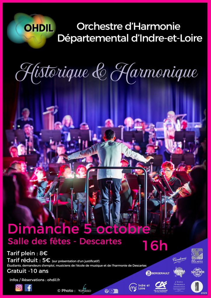 🎶 Concert de l’OHDIL – Historique & Harmonique. Rejoignez l’Orchestre d’Harmonie Départemental d’Indre-et-Loire le dimanche 5 octobre 2025 à la Salle des Fêtes de Descartes pour un concert exceptionnel. Entre tradition populaire et excellence musicale, laissez-vous emporter par un répertoire riche mêlant classiques, musiques de films et œuvres emblématiques.