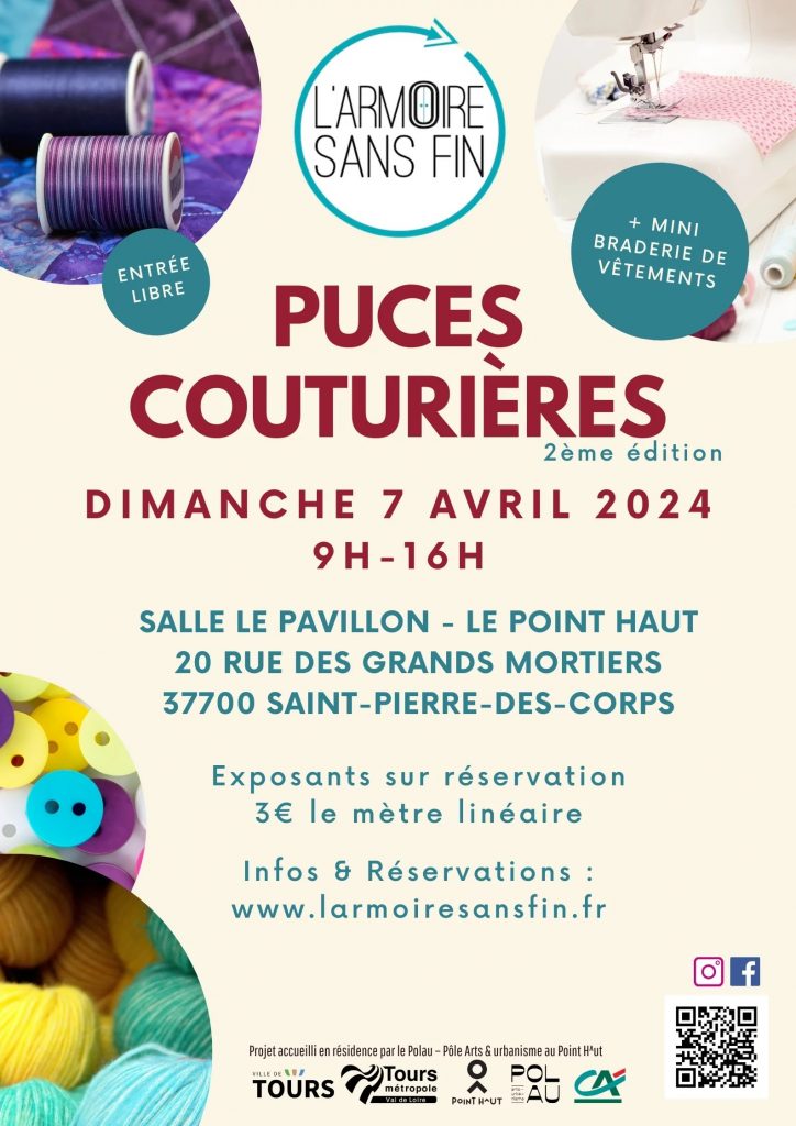 Aux puces, on trouve tout le matériel de seconde main en rapport avec les travaux d’aiguilles (couture, broderie, tricot, crochet…) : tissus, patrons, fils, dentelles, broderies, canevas, boutons, laines, machines à coudre, livres, conseils…