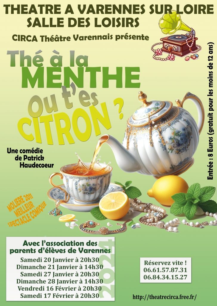 Le Compagnie CIRCA, située près de Bourgueil et Chinon, vous invite aux représentations de sa nouvelle création, « Thé à la Menthe ou t’est Citron? ». Une comédie déjantée de Patrick Haudecoeur. Vous allez assister à la répétition d’un Vaudeville, avec tous les classiques que nous connaissons, mais où rien ne se passera comme prévu. Venez rire et vous détendre avec CIRCA Théâtre Varennais.