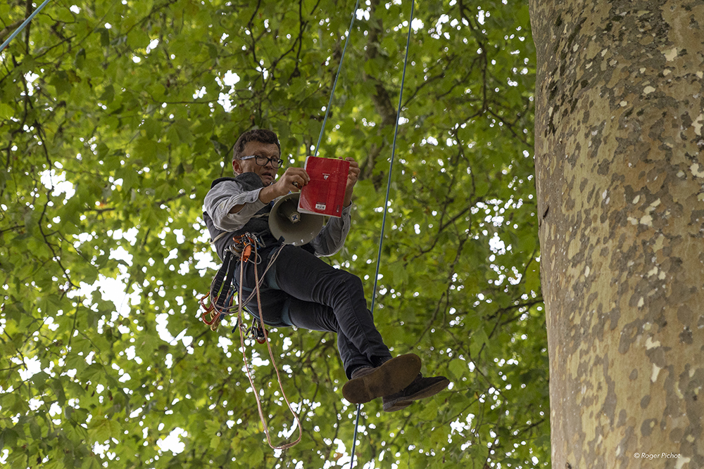 Moment insolite de la journée : dans l’allée des écrivains, l’aventurier-écrivain Sylvain Tesson a offert aux spectateurs une scène à la fois poétique et spectaculaire. Fidèle à son goût pour les ascensions inattendues, il a grimpé dans un platane majestueux avant de déclamer une ode à Gonzague Saint-Bris, fondateur du festival aujourd’hui disparu (après un accident de la route).