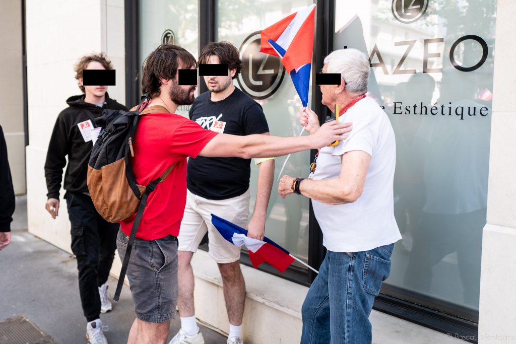 Alors que la manifestation avance tranquillement, Pierre, 77 ans, t-shirt François Fillon 2017, apparaît à la fenêtre de son domicile, puis descend en agitant des drapeaux français. Manifestement pas en accord avec la manifestation, mais avant qu’il n’ait prononcé une parole, quelques militants viennent lui arracher ses drapeaux sans ménagement, rapidement rappelés à la raison par le service du PCF. Après avoir retrouvé ses drapeaux, ce gaulliste historique peste de ne pas voir de drapeaux français dans la manifestation, et rappelle à qui veut l’entendre que chacun est libre de voter pour qui il souhaite.