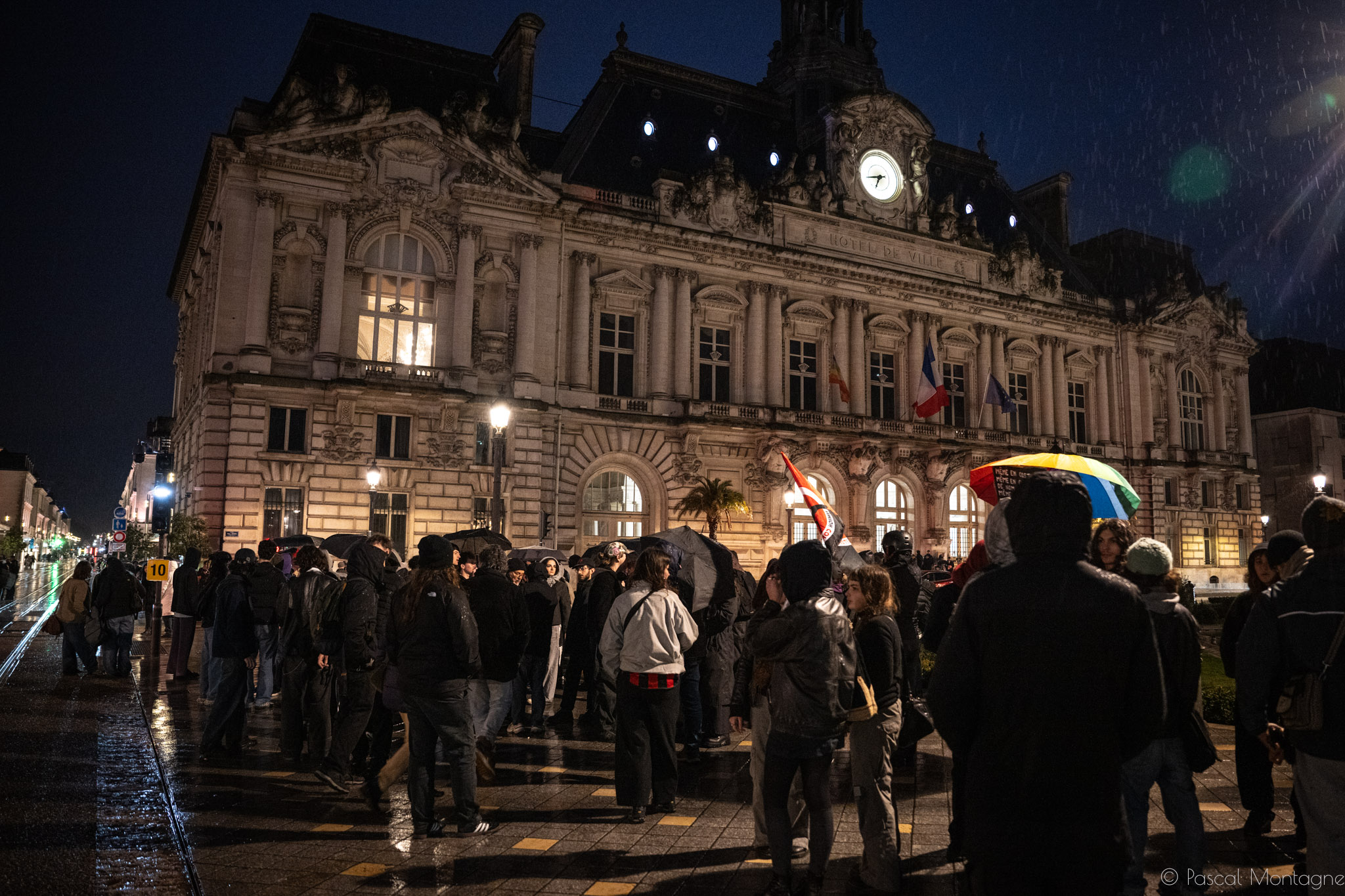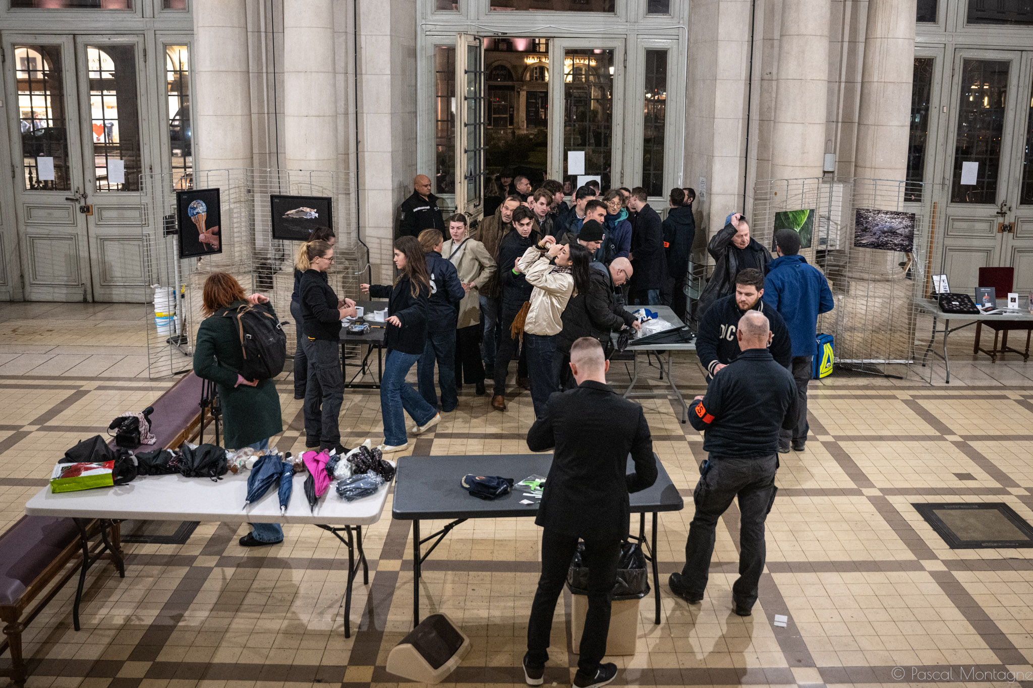 Un meeting qui se jouait à guichet fermés : 250 personnes en rangs serrés, quelquefois assises par terre, reflet du succès actuel des idées du RN dans une partie de l’opinion. Une dizaine de membres du DPS, le service d’ordre du parti, fouillait chaque participant avec méthode, afin d’éviter toute intrusion non désirée, car sous les fenêtres de la salle, près de 200 contre-manifestants majoritairement issus de l’extrême gauche manifestaient bruyamment leur opposition, sous l’oeil attentif d’une cinquantaine de policiers.