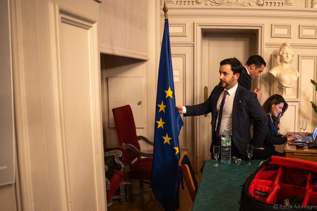 Suivant Aleksandar Nikolic arrivé de la commission Européenne quelques minutes plus tôt, Jean-Philippe Tanguy, désireux de mettre l’ambiance, retire dès son arrivée le drapeau européen, mauvais sort fait à une institution pourtant généreuse envers les cadres du parti à la flamme.