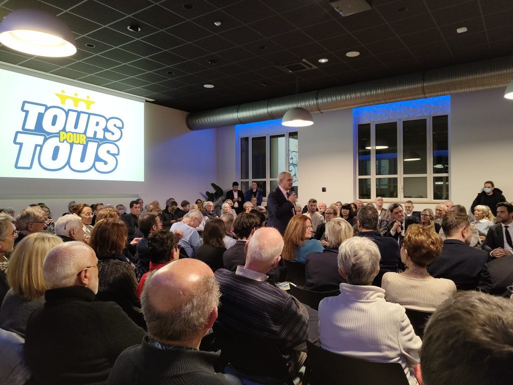 Une semaine plus tard, à la même heure, c’était au tour de Christophe Bouchet donc de se plier à l’exercice. A quelques centaines de mètres de l’Hôtel de Ville convoité, c’est dans les locaux de Waza (ex HQ) que le candidat de centre-droite a rassemblé ses soutiens. Environ 300 personnes ont garni la salle, avec aux premiers rangs, les invités de marque : référents de partis politiques, présence de personnalités comme l’ancien maire et sénateur Serge Babary, le président de Tours Métropole Frédéric Augis, les soutiens de la première heure mais aussi nouveaux soutiens fraichement débarqués.