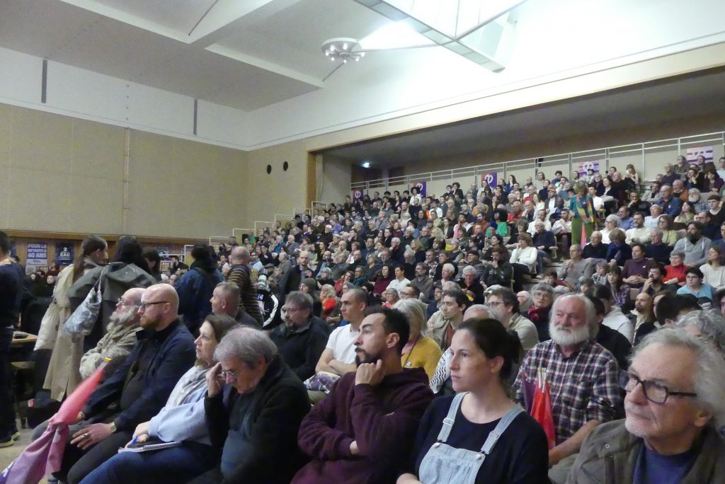 Il ne fallait pas être en retard pour voir Jean-Luc Mélenchon sur la scène de la salle des fêtes de St-Pierre-des-Corps. Plusieurs dizaines de personnes sont restées sur le parvis faute de places suffisantes, bénéficiant tout de même d’une retransmission audio du discours grâce à des enceintes installées dehors. A l’intérieur, ce sont plus de 500 personnes qui avaient pris place sur les chaises et banquettes, face au patron de La France Insoumise. Une assistance assez panachée au niveau des âges, plutôt paritaire. Venue de tout près ou d’un peu plus loin (un petit groupe du Mans, par exemple).