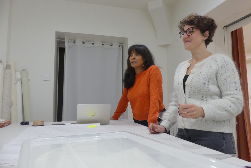 L’enjeu est tel qu’Agnès et Gaëlle conseillent à leurs clientes de ne pas venir accompagnées avec trop de monde, pour ne pas trop se brouiller l’esprit. En revanche, elles font tout à deux. Les interviews avec prise de notes « parce qu’on ne retient pas forcément les mêmes choses », les dessins (même si parfois elles créent dans leur coin avant de mettre en commun) puis les différentes étapes de confection. Celle-ci passe par un premier prototype en coton avec essayage avant de passer aux tissus définitifs. Cela a par exemple permis d’abandonner l’idée d’un dos fermé pour une future mariée qui aura finalement une robe laissant apparaître le haut du dos.