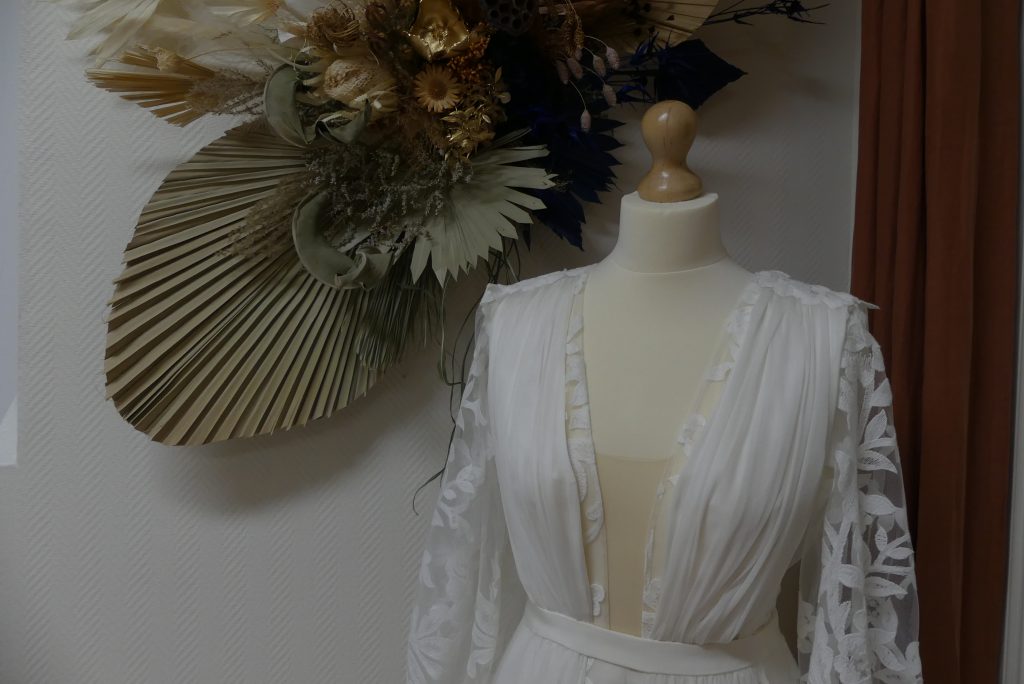 Gaëlle Raissignier froisse et défroisse le patron d’une des premières robes de mariée de Jasmée, la maison de couture qu’elle a cofondé avec Agnès Pancrassin. La cliente a déjà fait un premier essayage et validé le devis : son union est prévue aux beaux jours de 2024. « On fait tout à la main » raconte la professionnelle, toute fière d’avoir récemment obtenu le label artisan d’art. 2 à 3 rendez-vous essayage seront nécessaires dans les prochains mois pour valider définitivement la tenue.