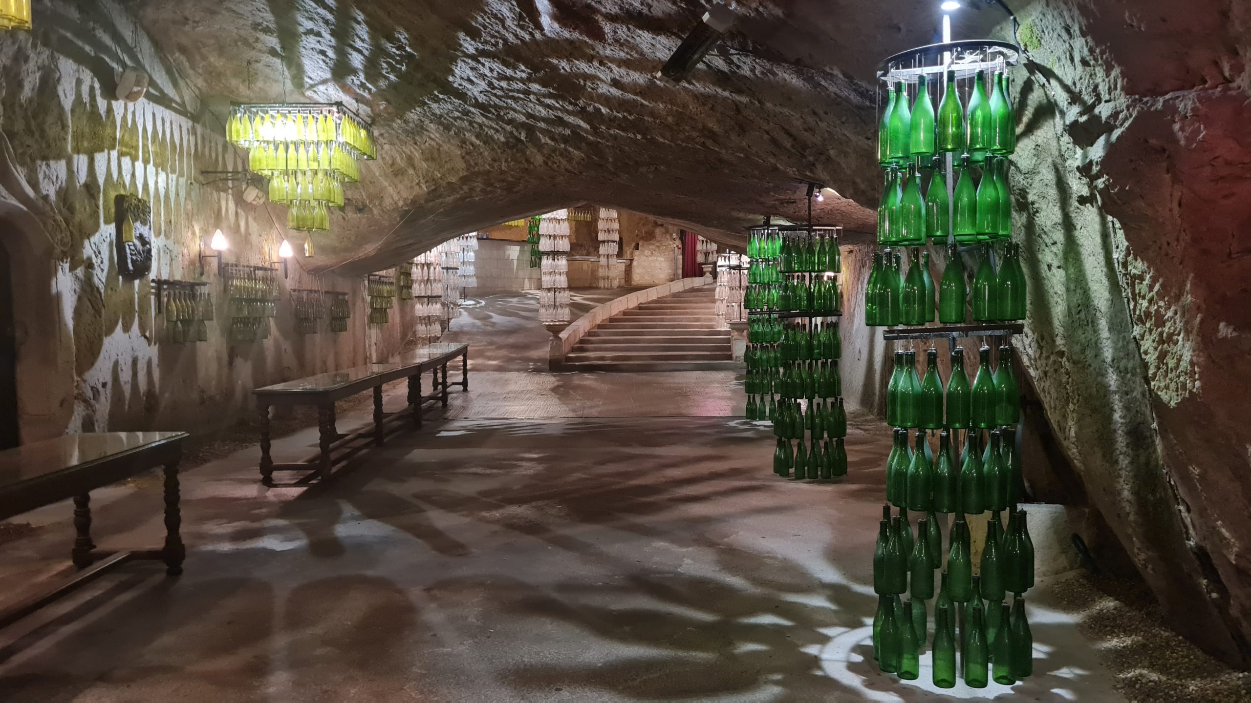 Avec leur éclairage tamisé, leurs sculptures en bouteilles de vin et le ruissellement de l’eau, les Caves Painctes ne manquent pas de charme. Voilà une belle vitrine pour l’appellation aux plus de 85 ans d’âge (création en 1937, élargie en 2016 et comptant actuellement 160 domaines). Le lieu a une place dans l’histoire viticole… mais aussi littéraire : « Rabelais en parlait » note Sébastien du Petit Thouars. Eternel épicurien, mascotte chinonaise, l’auteur qui a vécu en Touraine est dignement honoré par les banquets qui se déroulent encore sous les voutes pouvant accueillir 200 personnes, notamment pour le festival automnal Les Nourritures Elémentaires (thème 2023 : l’obscénité).