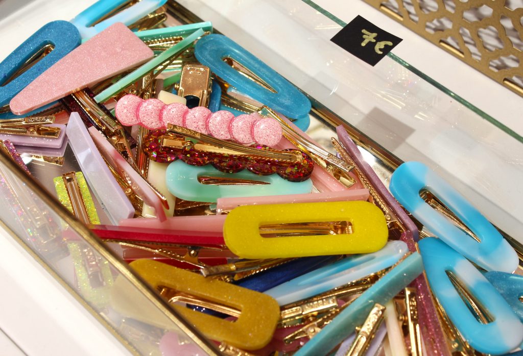 Petit à petit, la trentenaire s’éloigne de La fabrique à jus et se consacre à sa nouvelle activité. Son commerce évolue et les barrettes en tissu se transforment en barrettes en résine. En plus des pinces pour les cheveux, elle fabrique désormais des bijoux afin d’élargir sa gamme de produits. Elle conçoit tous ses accessoires grâce à des moules spéciaux dans son atelier, installé dans un coin de la boutique Les trouvailles V/O depuis septembre. Un avantage selon elle. « J’aime bien avoir un point de fabrication physique, qui peut être vu. Cela crée du lien et fait le lien entre nos différents projets. Les gens ont par exemple pris le réflexe de venir ici lorsqu’ils ne trouvent pas un modèle sur le site. Lorsque nous échangeons, ils me donnent aussi parfois des idées. C’est hyper enrichissant », indique-t-elle. Laurène regrette cependant de manquer de temps, ce qui l’empêche d’être plus présente sur les réseaux sociaux, où elle aimerait notamment montrer ses techniques de travail, comme le démoulage des barrettes.