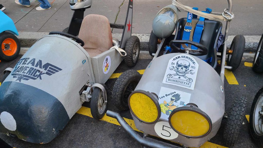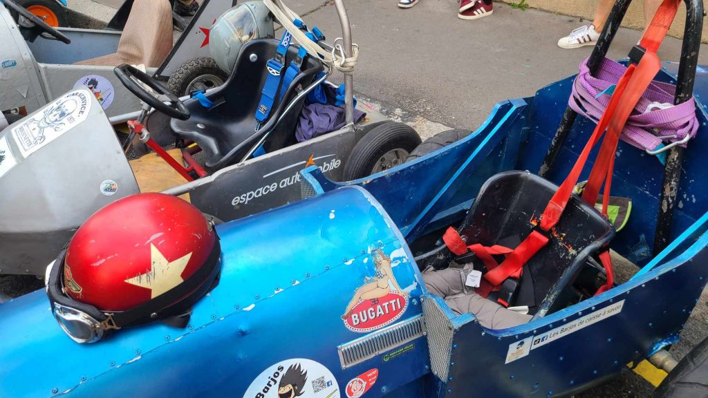 Juste à côté, Les Barjos ont un peu plus d’ambitions. Venue avec 4 véhicules, l’association chinonaise a raflé les trois prix du chrono avec une descente en seulement 57 secondes pour leur dernière production, La Carotte, qui avait terminé 2e à Rochecorbon. Un légume roulant sur tous les fronts puisqu’il a également été récompensé du 1er prix de l’originalité. Et pourquoi la carotte ? « Parce qu’à la base on est paysagistes » nous expliquent-ils, devant l’engin réalisé à partir de bidons d’huile colorés en orange. La blague : il y a même les fanes à l’arrière.