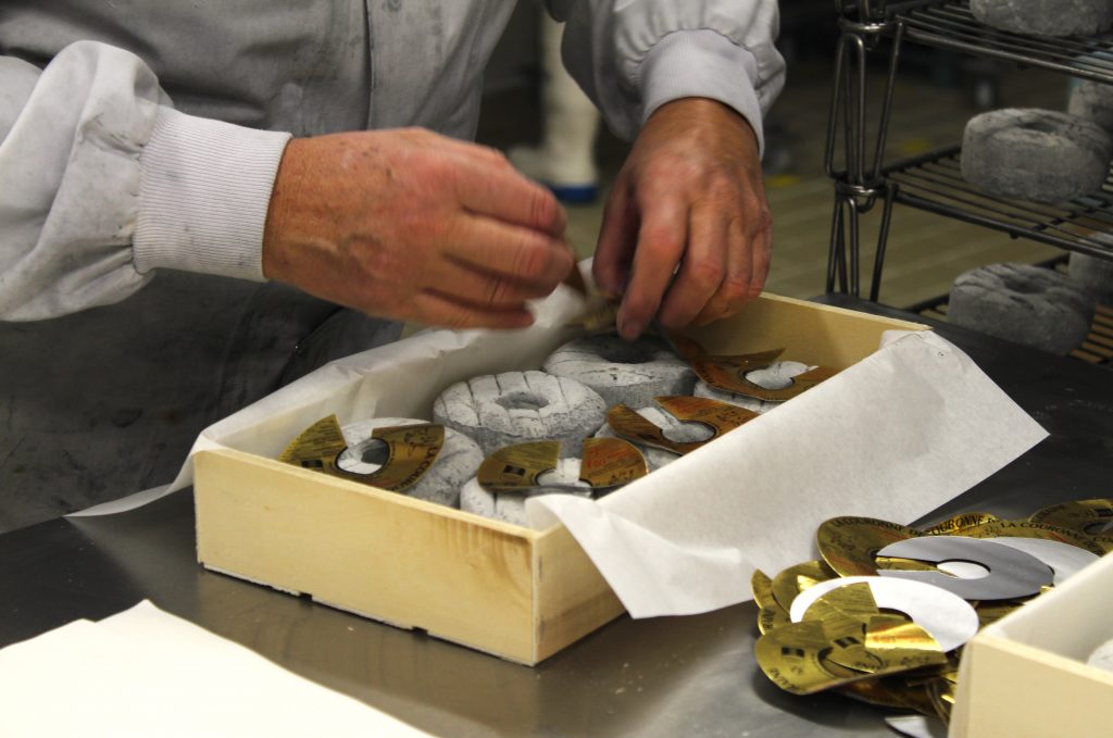 Chez Cloche d’or, les salariés sont polyvalents. « En général, ils sont capables de réaliser toutes les étapes parce que, sur la journée, ils peuvent faire plusieurs tâches. Ils ne restent pas sept heures à faire la même chose », assure Cédric Carcaillon. Une polyvalence d’autant plus importante que, dans la fromagerie de Pont-de-Ruan, presque toutes les étapes de fabrication sont réalisées à la main. « Nous faisons comme dans une petite ferme. Tout est artisanal. Nous moulons et démoulons à la main… Il n’y a quasiment aucune machine. » La seule machine en action pendant notre visite est celle de l’atelier de conditionnement, qui permet de mettre les fromages dans des barquettes pour la grande distribution. Les chèvres destinés aux fromagers sont, eux, placés à la main dans des petites boîtes en bois. Une nouvelle machine pourrait cependant être prochainement mise en service pour le salage.