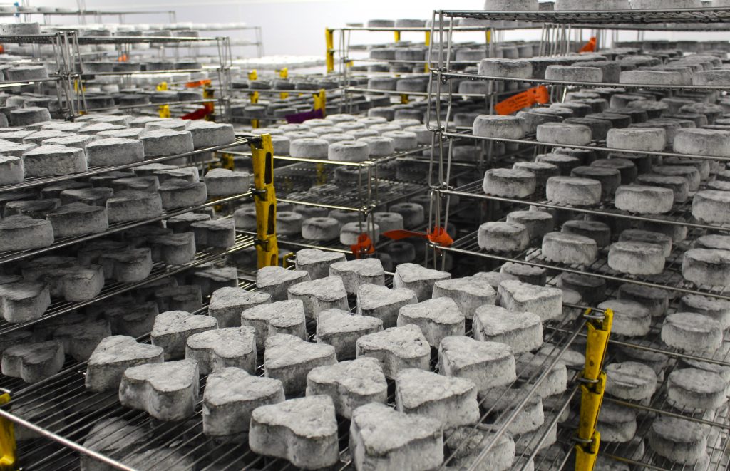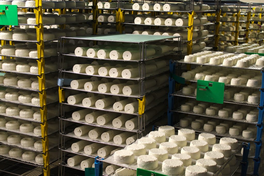 Vingt-quatre heures plus tard, les fromages peuvent être moulés. « Nous déposons le caillé dans les moules et nous les laissons s’égoutter jusqu’au lendemain matin. Les fromages seront ensuite démoulés, déposés sur des claies (des sortes de grilles), où ils seront salés, puis cendrés », explique le directeur de Cloche d’or. Ils sont ensuite installés dans les différents haloirs de la fromagerie afin d’être affinés. « Chaque fromage est retourné à la main. Nous les changeons parfois d’étage pour qu’ils sèchent de façon uniforme », détaille Cédric Carcaillon. Pour le Sainte-Maure-de-Touraine, qui doit respecter un cahier des charges aux nombreux critères (alimentation et race des chèvres, zone géographique délimitée, température et degré d’hygrométrie précis…) afin d’acquérir son appellation d’origine protégée, l’affinage doit durer au minimum dix jours. Pour les autres types de chèvre, ce sont les fromagers qui choisissent le temps d’affinage, selon le goût et la texture qu’ils souhaitent obtenir.