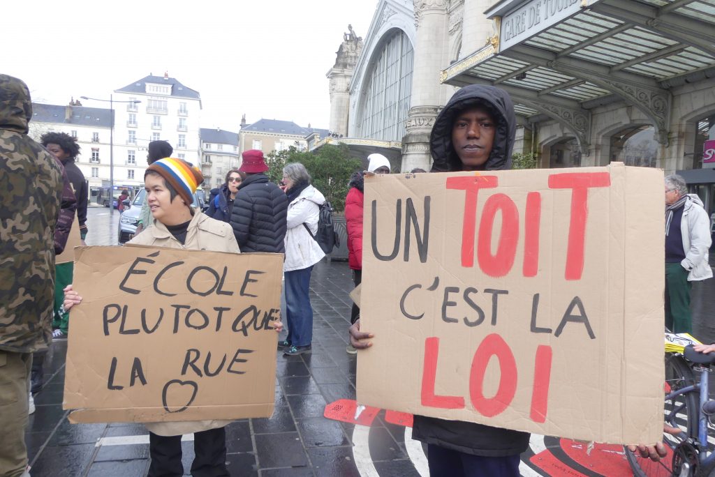 “Nous sommes là pour faire entendre nos droits”, explique Abdoul, 17 ans, porte-parole du Collectif Jeunes de Tours, entouré de pancartes “Un toit, c’est la loi !”, “Reconnaissance et dignité pour tous les jeunes” ou encore “Et si c’était votre enfant ?”.