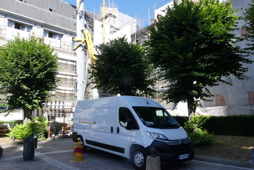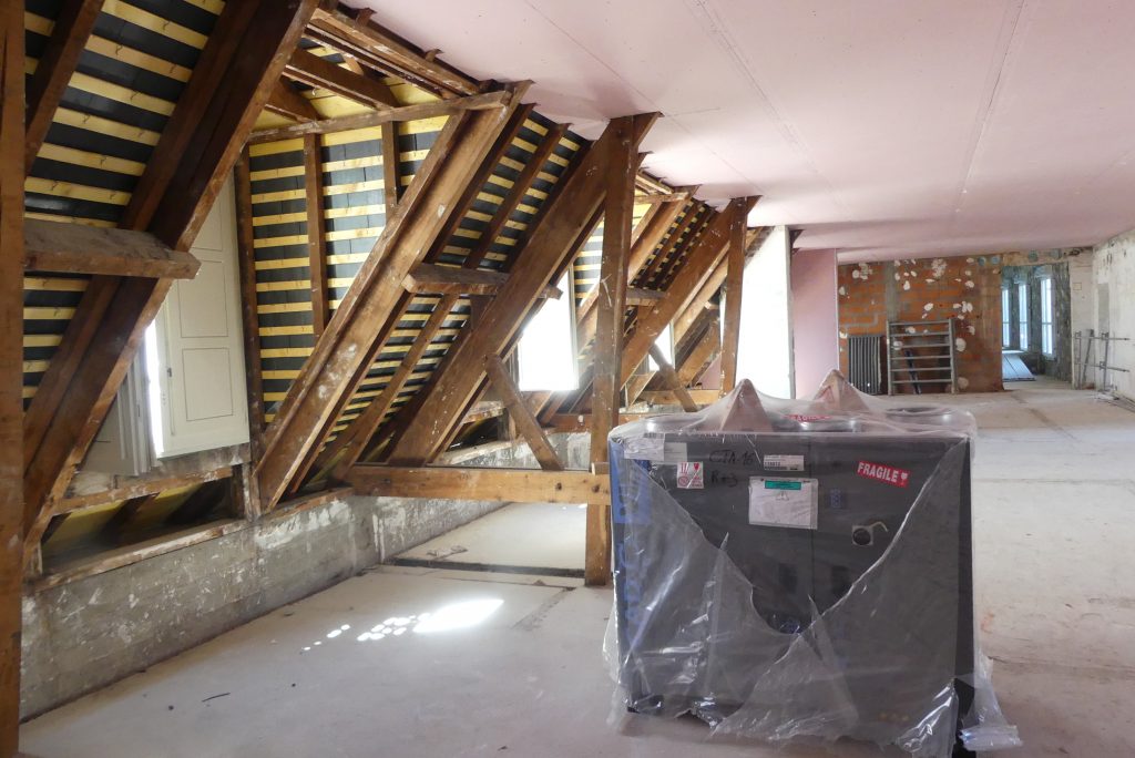 Près d’un an plus tard, « à chaque visite toutes les 2-3 semaines on observe de grands changements » note un observateur régulier des opérations. Ce sont actuellement une demi-douzaine d’entreprises et 67 ouvriers qui s’affairent quotidiennement du rez-de-chaussée au toit. « On est au pic de l’activité » nous explique-t-on. 450 menuiseries sur-mesure ont été nécessaires. Le toit en ardoise a été totalement refait.