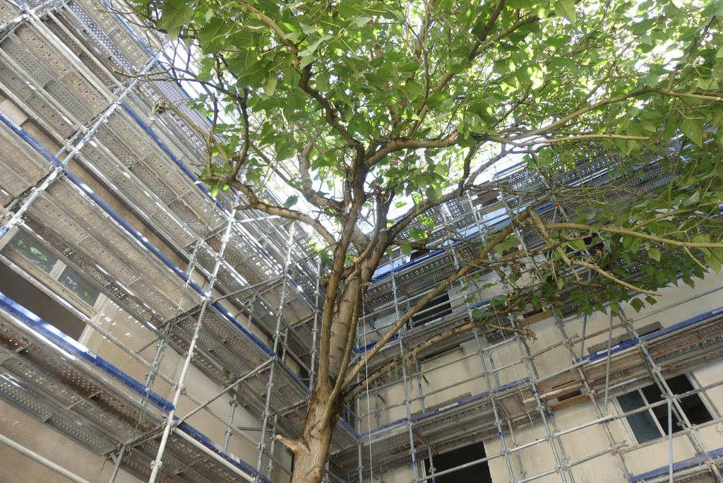 Tous ces lieux entoureront une cour dans laquelle un jardin doit être aménagé. Le grand arbre déjà présent au milieu du bâtiment sera conservé car on a eu la garantie qu’il pourrait continuer de se développer et qu’il ne faisait pas porter de risque sur la construction. Découvrez ci-dessous des photos du chantier.
