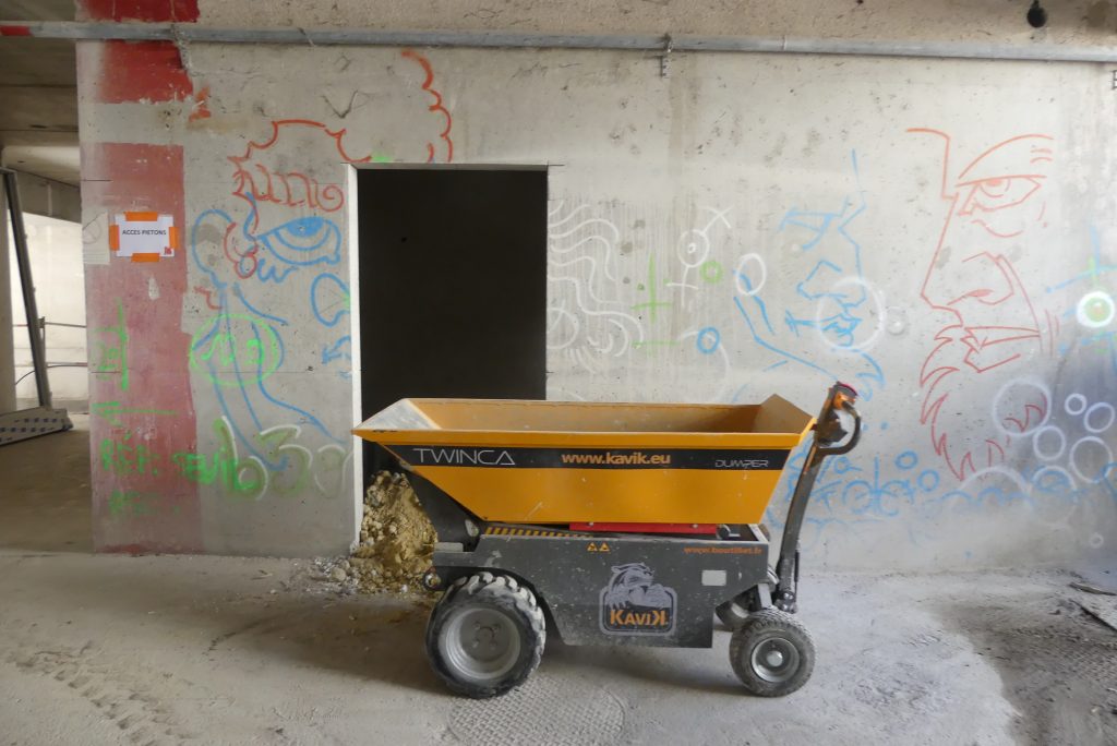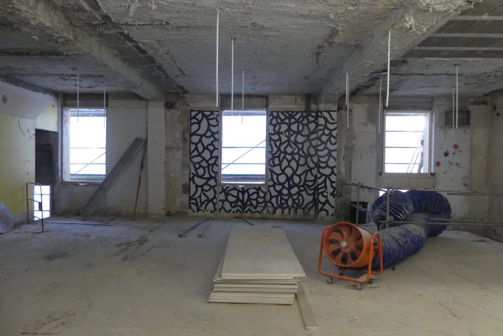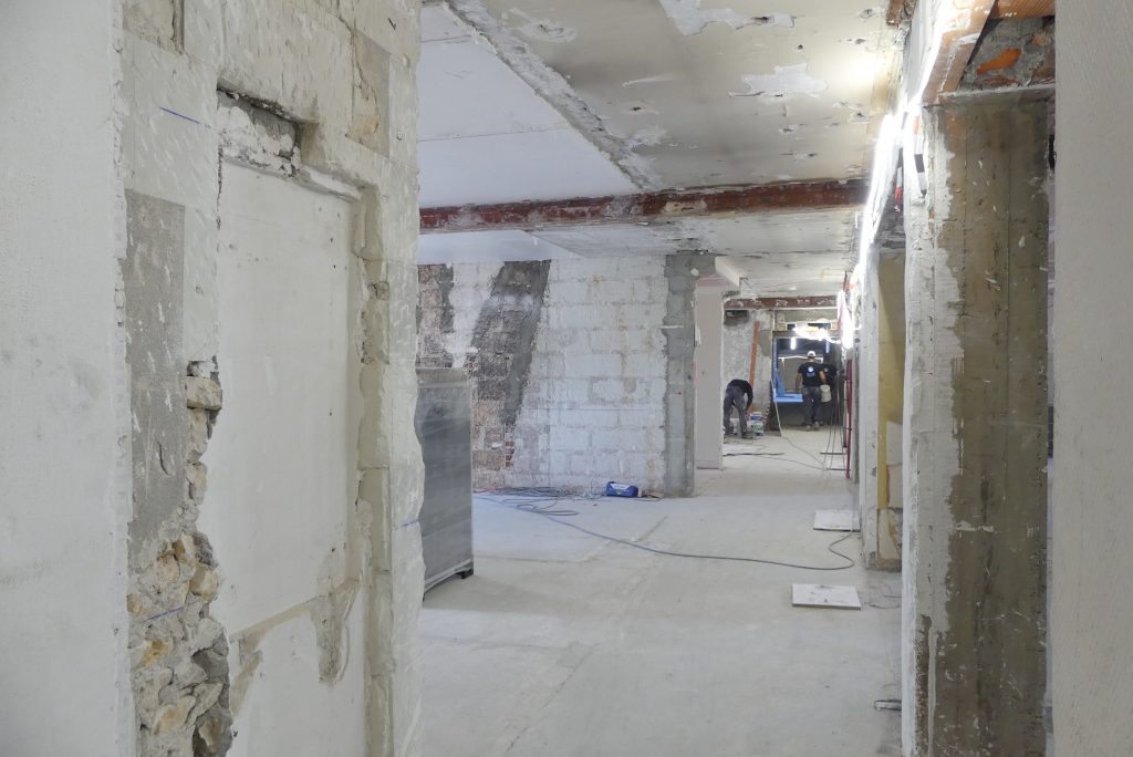 Ce temps long doit permettre de rentabiliser les investissements consentis. La SET pose 18,5 millions d’€ hors taxes sur la table pour rénover les lieux de fond en comble puis les louer à différents acteurs. Après les tractations administratives d’usage, qui se sont déroulées pendant l’exposition de street art, le chantier a pu démarrer en septembre 2024. Il a commencé par une opération de démolition, nécessitant de casser les 180 chambres. Des tonnes et des tonnes de gravats ont été extraites à la main, avec une ambition d’en recycler au maximum. Jusqu’à 50 personnes ont travaillé sur cette opération.