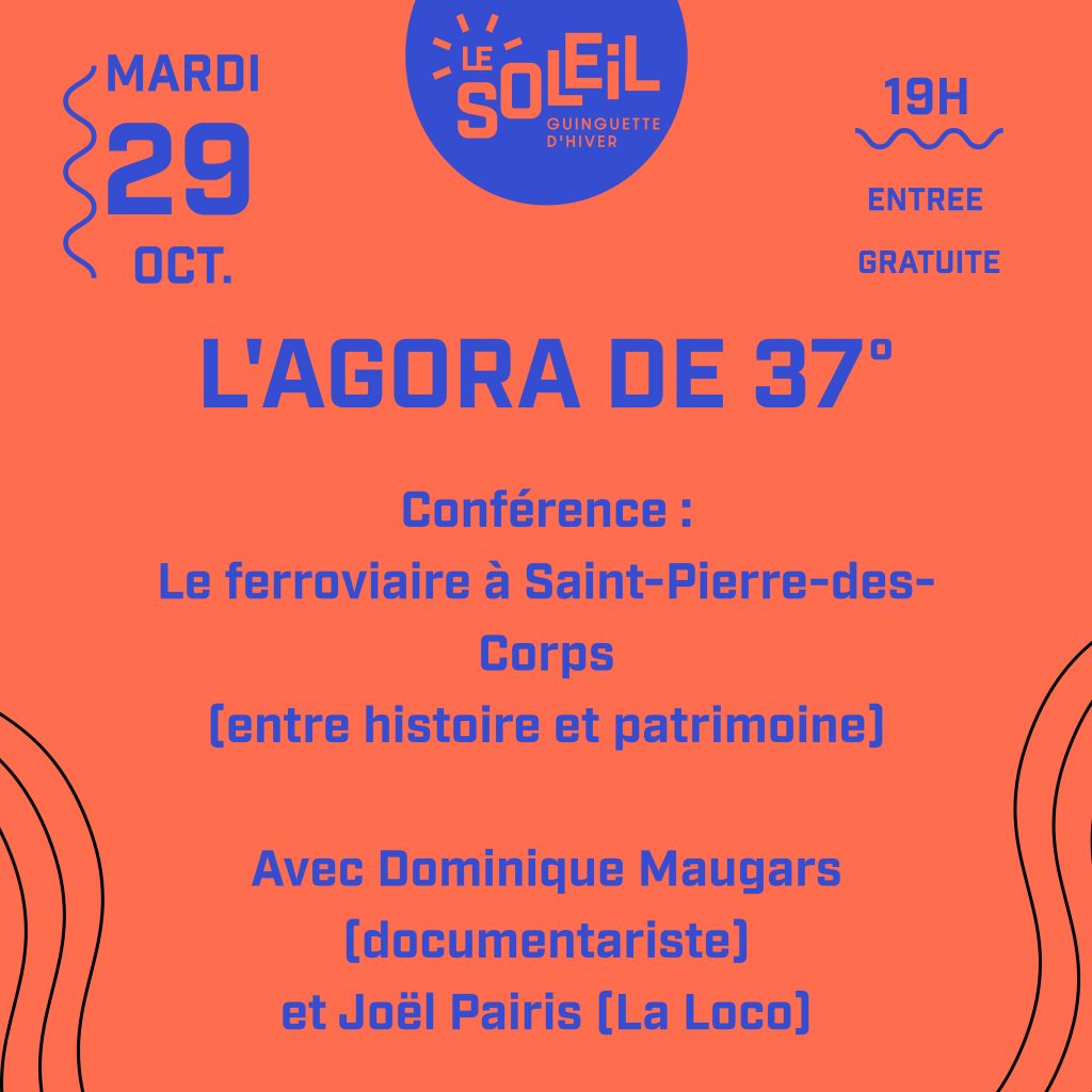 Prochaine agora ce mardi 29 octobre à 19h au Soleil (9000 rue de la Grange Quillet, Saint-Pierre-des-Corps) : Le thème sera le ferroviaire à Saint-Pierre-des-Corps : entre histoire et patrimoine. Les invités seront Dominique Maugars (documentariste) et Joël Pairis pour l’association La Loco.
